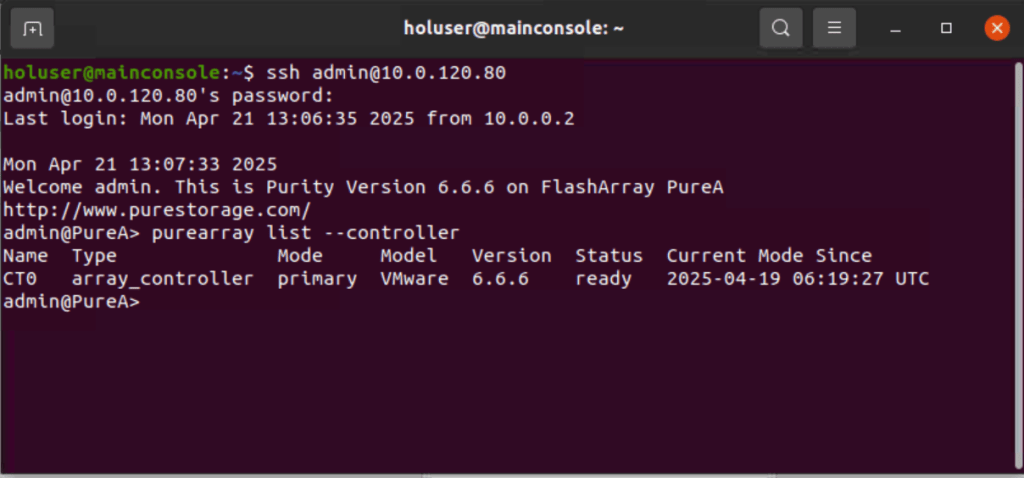Also, make sure to explore the CLI commands of the Purity Operating System. To do this, launch Terminal from the taskbar and run, ssh admin@10.0.120.80 with the password VMware123!